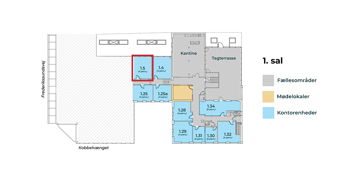 Lokale 1.5 er beliggende på 1. etage tæt på det fælles frokostkøkken, mødelokale og tagterrasse. Den ene væg har vinduespartier i fuld bredde, som giver masser af lys til lokalet. Udsigten er til en baggård og tilstødende erhvervsbygning. Lokalet er velegnet til fire møbelsæt eller til færre personer med plads til lille mødesektion.