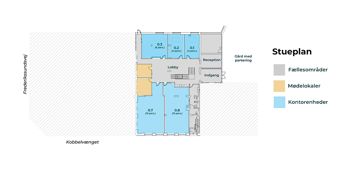 Indgang til denne etage ligger i gården med indkørsel fra Kobbelvænget. Får du mange gæster, kan det være en fordel for dig at vælge et kontor her. Det samme gælder, hvis du har behov for handicapvenlige forhold.